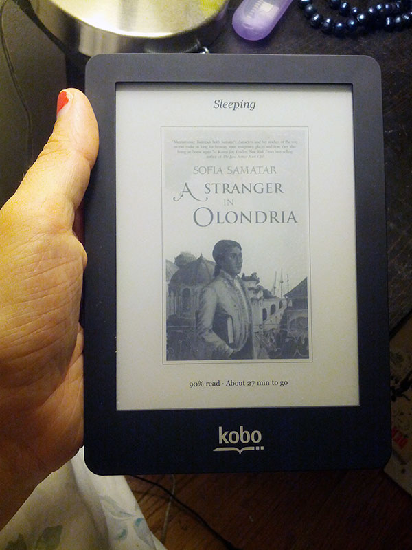 I’ve finished my second whole book on the Kobo and am plowing into my third. Yet for the past few days I’ve been wrestling with how to talk about A Stranger in Olondria by Sofia Samatar. I had to read a couple outside reviews to nail down my feelings. The positive one points out that it’s a love letter to books and reading, while at the same time exploring the tension between history, literate societies and oral societies. The frustrated one more mirrors my own experience, in that I spent most of the novel irritated by the ponderously layered language and cultural constructs, and by the “boy meets dying girl, dead girl haunts boy, boy falls in love but must set both of them free” plot.